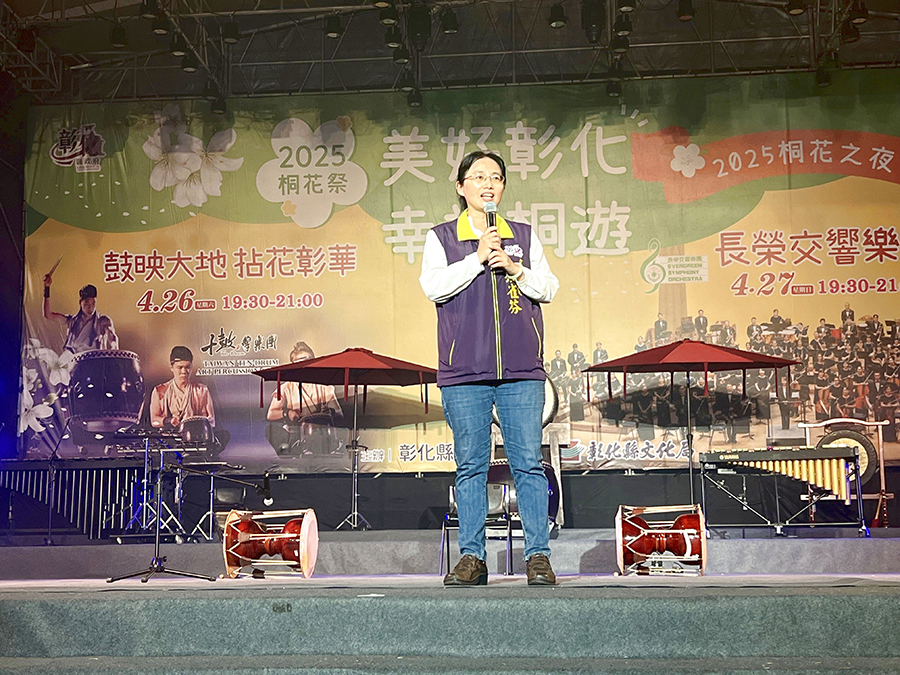 【記者鄭惠珠彰化報導】「2025美好彰化~幸福桐遊」系列活動熱力展開,26日晚間於彰化縣立體育場隆重登場的「桐花之夜」首場演出,由享譽國際的十鼓擊樂團帶來震撼人心的擊樂盛宴,吸引數千名民眾共襄盛舉,由文化局長張雀芬代表縣長王惠美與會,現場鼓聲雷動、光影交錯,讓觀眾在桐花綻放的春夜中,感受視覺與聽覺交織的文化饗宴,共度美好的桐花之夜。