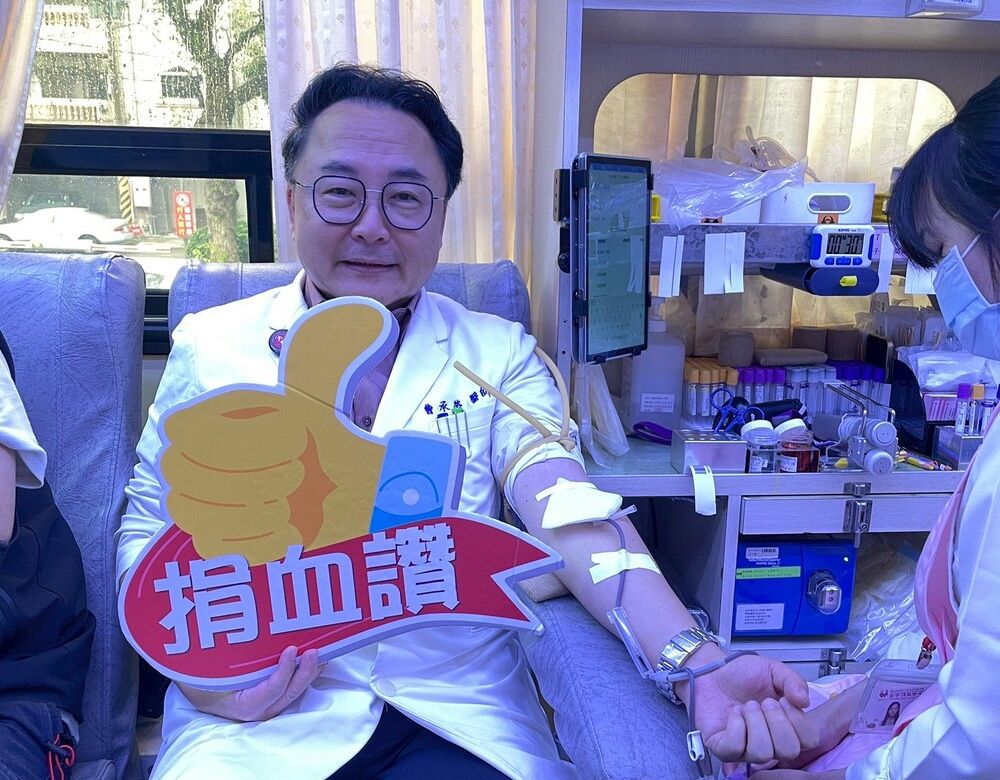 院內同仁響應捐血活動,趁著門診的空檔,曹副院長一口氣捐了500cc。 定期捐血,不但可加快排出體內已老化的紅血球,減輕脾臟的負擔;更可刺激骨髓的造血,加速紅血球的生成,促進血液的新陳代謝。捐血中心呼籲民眾可定期捐血,除了單位的捐血活動,也可到各處的捐血站進行捐血,讓愛與生命延續,攜手填滿每一袋希望。