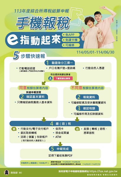 李怡慧表示,113年度綜合所得稅結算申報期間,自今年5月1日開始,因應美國對等關稅政策對我國經濟之影響,為減輕民眾申報作業負擔及繳稅資金壓力,申報截止日延長至6月30日止。往年每到綜所稅申報季,國稅局總是人滿為患,經過漫長排隊等候,民眾報完稅已精疲力盡。現今已經是人手一機的時代,利用「手機報稅」除了可編修配偶、扶養親屬的所得及扣除額資料外,用手機報稅時,搭配行動自然人憑證或行動電話認證登入報稅系統,就能下載檢視「稅額估算表」,確認採用估算表內容及輸入繳(退)稅資料後,即可執行「申報資料上傳」完成申報,縮短申報時間超有感。另外,還可選擇使用現金、信用卡、活期存款帳戶、委託取款轉帳、ATM、行動支付或電子支付帳戶方式繳稅,同時提供附件上傳功能,便利又多元,讓民眾能輕鬆完成申報,快速又方便。