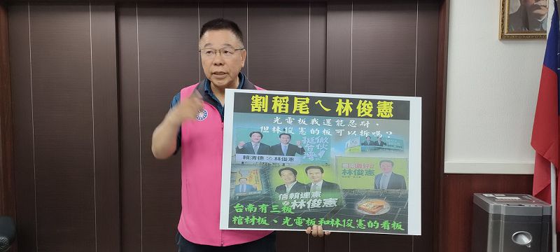 蔡育輝更高舉手板說,林俊憲既然高掛看板說新東里立體停車場是他爭取,陳亭妃立委都出席,為何林俊憲只派個助理來,本人卻未到,還臉書抹黑他率眾鬧事,林俊憲可知台南鄉親對於林俊憲割稻尾看板,在全台南市掛滿滿,有民眾做了台南市長選舉看板地圖嗎?陳亭妃只有小部分看板,地圖上林俊憲看板卻是鋪天蓋地,還有鄉親看不下去,直接做哏圖酸林俊憲,台南名產三大板『棺材板、光電板、林俊憲割稻尾看板』。