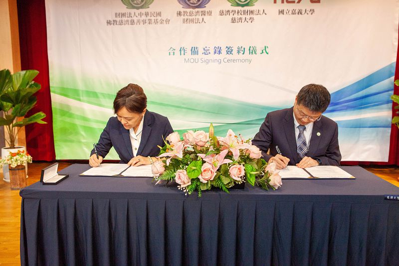 簽約典禮於慈濟大學舉行,由慈濟慈善事業基金會顏博文執行長,慈濟醫療財團法人林俊龍執行長,以及慈濟大學劉怡均校長和嘉義大學林翰謙校長代表簽約,包括教育志業王本榮執行長,慈大副校長戴昌賢、陳宗鷹、何縕琪,以及嘉義大學副校長洪滉祐、陳瑞祥、張俊賢等人出席,共同見證這歷史性一刻。