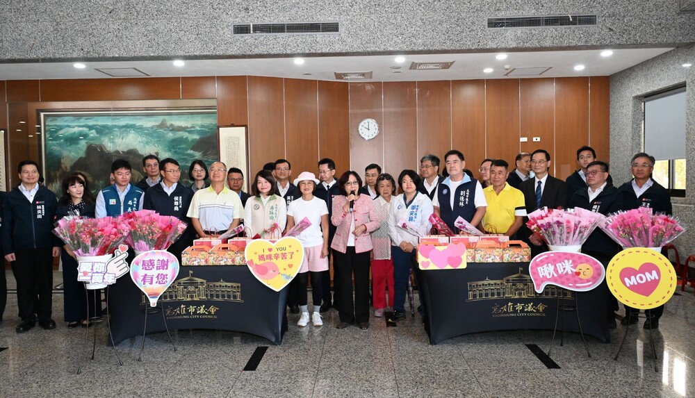 【記者于欽智高雄報導】高雄市議會1日舉辦「大聲說愛媽媽」活動為母親節暖身,議長康裕成邀請議員同僚與市府各局處首長共襄盛舉,提前為媽媽們獻上祝福;另康議長還致贈每位員工康乃馨及桂圓糕,祝福媽媽們健康快樂、「呷百二」。