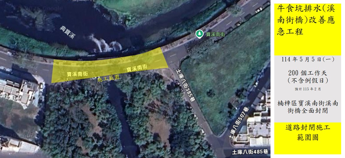 【記者陳志昌高雄報導】高市楠梓區寶溪南街(溪南街橋)訂於114年5月5日(星期一)上午8點起,由市府工務局新工處進行全面封閉施工,新工處表示,工期預計為200個工作天(不含例假日),施工期間請用路人配合現場作業人員引導,以及牌面指示提早改道。