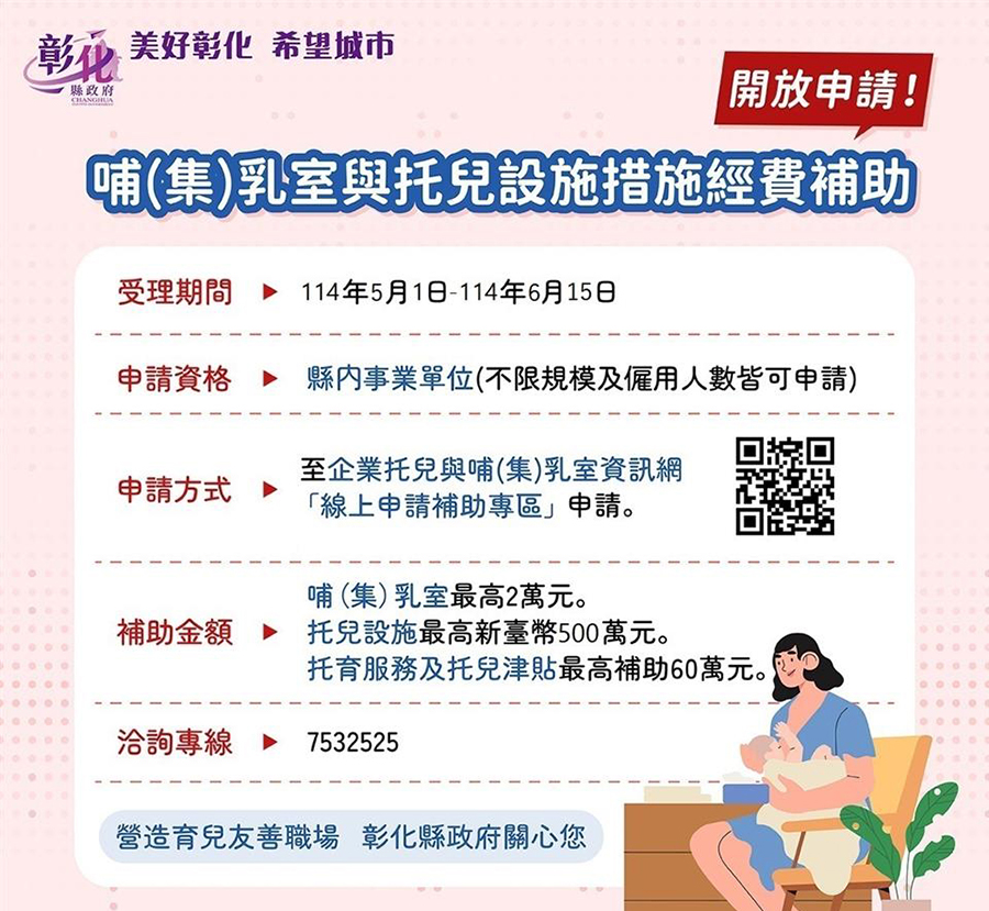 【記者鄭惠珠彰化報導】為營造育兒友善職場環境,促進企業留用優良人才,平衡員工家庭與工作的負擔,彰化縣政府自114年5月1日至114年6月15日開放受理縣內事業單位申請哺(集)乳室、托兒設(措)施之經費補助,歡迎踴躍向勞工處申請。
