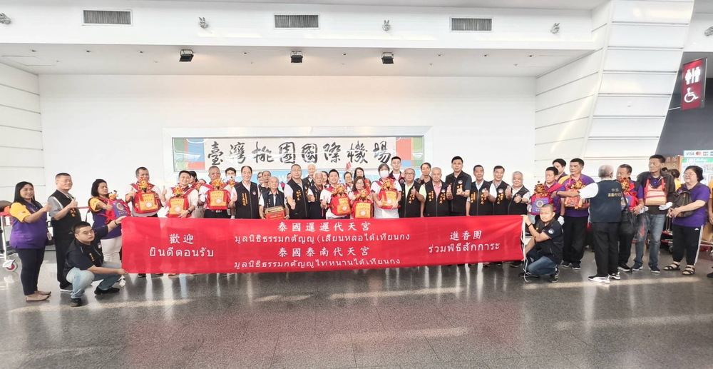 圖:泰國「暹邏代天宮」與「泰南代天宮」2宮組團回台灣南鯤鯓代天府祖廟謁祖進香,桃園機場接機情形。(記者黃永豐攝)