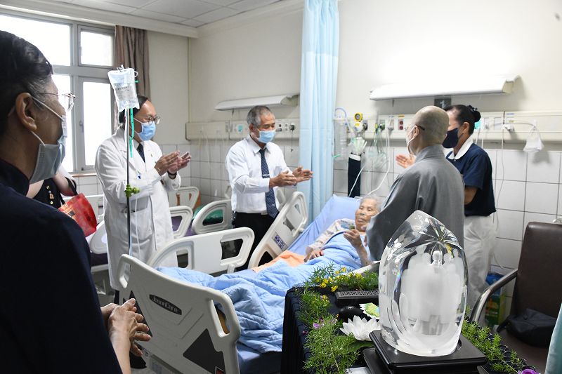賴寧生院長與德(耒英)師父等人前往10樓與11樓病房行動浴佛,為大家送來祝福。雲林慈濟志工蔡清森91歲的母親在大林住院治療,精舍師父特地帶領大家為蔡媽媽唱台語的祝福歌,祝福蔡媽媽早日康復。蔡師兄感動表示,因為媽媽沒辦法下樓去參加浴佛,感恩精舍師父和院長與慈濟人帶著宇宙大覺者,到病房來給媽媽浴佛,真的很感恩,在一年一度的佛誕節、母親節,報答親恩與眾生恩。