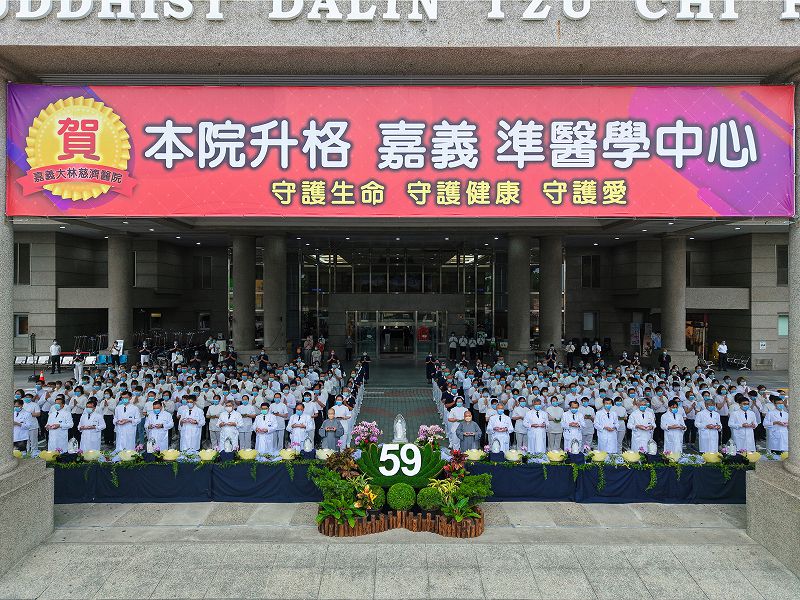星期日上午不到七點,靜思精舍德(耒英)師父、德䎯師父,帶領大眾在醫院大門口正式展開浴佛,今年受到鋒面影響,擔心雨勢影響,將場地移至雨披廣場及大廳,活動不減莊嚴。大林慈濟醫院賴寧生院長指出,適逢慈濟59周年慶,也是大林慈濟醫院建院25周年,在這樣殊勝的日子裡,大林慈濟醫院同仁在精舍師父的帶領之下,懷著虔誠的心來祈禱,希望無災無難,最重要地是我們要承擔,希望讓我們同仁能夠大家一起爭取四年以後的醫學中心。
