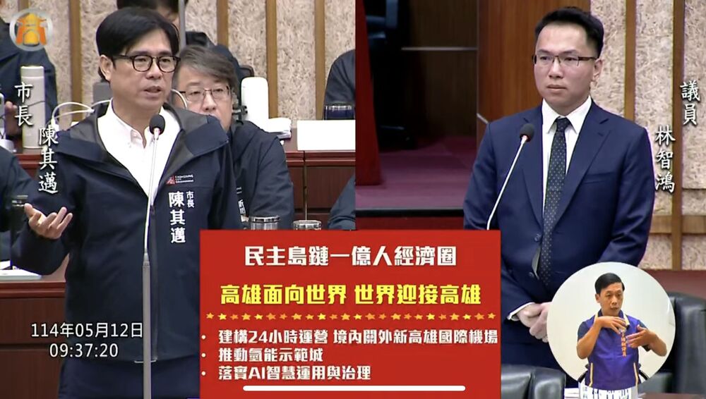 【記者于欽智高雄報導】高雄市議員林智鴻12日總質詢,針對台灣安全向市長陳其邁就教,強調全民應團結守護自由民主,確保台灣走在「自由民主」正確路線,並倡議闢建24小時「境內關外」新高雄國際機場,推民主島鏈一億人經濟生活圈。