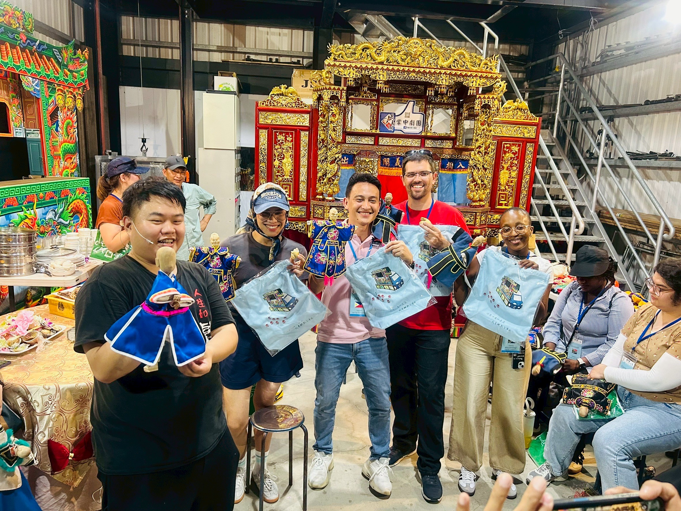 此次行程包括參訪古蹟洋樓、客家文化館、傳統廟宇、民俗館及隱藏的藝術巷弄,外籍英語教師也親身體驗了打陀螺活動,感受傳統民俗技藝的魅力。外籍英語教師也前往「長義閣掌中劇團」在嘉義縣溪口鄉的「偶聚空間」,了解布袋戲的歷史發展,並親自操作偶戲、觀賞精彩的布袋戲默劇,進一步體會臺灣傳統藝術的精髓。午餐時刻,英資中心特別安排外籍英語教師們品嚐具有臺灣特色的傳統「辦桌」菜餚,由在地「總舖師」親自料理,滿桌佳餚讓所有外籍英語教師驚喜不已。菜色包括薄荷雞、鹹酥雞、炸春捲、清蒸蝦與魚等,豐富多樣的在地美食,不僅展現臺灣飲食文化,也讓外籍英語教師們體驗到臺灣人情味的熱情。許多外籍英語教師表示,第1次參加這樣的傳統辦桌,真的太好吃了!