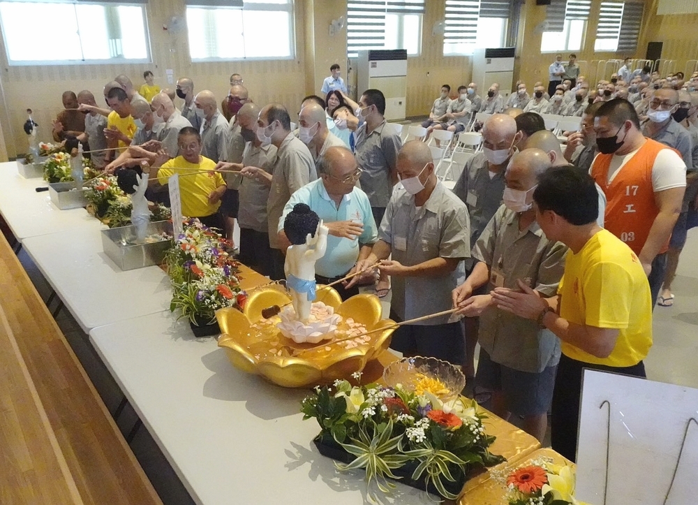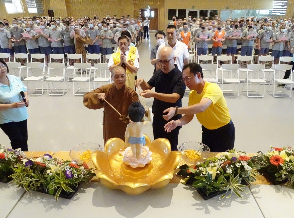 法會中進行浴佛灑淨儀式,藉此象徵洗滌過往業障與煩惱,重拾內在清淨。典獄長林豐材亦感謝佛光山的慈悲護持,希冀透過此次法會,讓收容人藉由宗教儀式重新審視自我、播下向善種子,實踐「說好話、做好事、存好心」的三好理念。