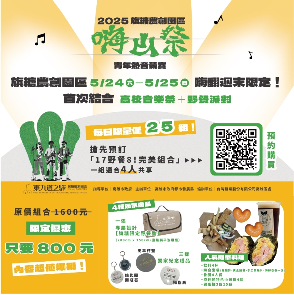 【記者吳峙嵩高雄報導】都市發展局將於5月24、25日一連兩天,在旗糖農創園區,舉辦「2025嗨山祭-青年熱音競賽」,匯聚來自全國青年熱音樂團同場競藝,一同回味2023年農創世紀音樂節的熱情與感動。現場另有「來旗糖野餐吧」主題市集,力邀民眾坐在草地上,一邊野餐、一邊享受動人旋律,感受音樂與土地共鳴的美好時光。