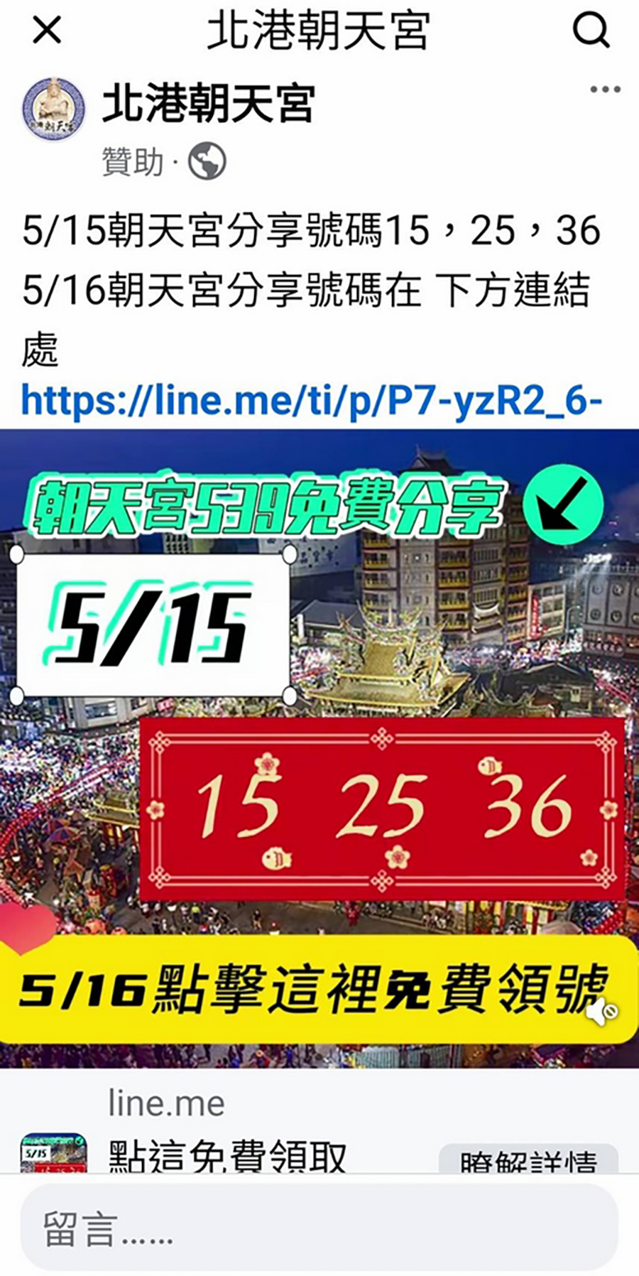 【記者雷琇雯雲林報導】台灣媽祖信仰總本山北港朝天宮,日前接獲善信通報,發現有不肖人士在臉書社群平台上冒用「北港朝天宮」相關照片及名稱,進行非法簽賭活動並散播不實資訊,甚至透過LINE群組與民眾電話聯繫,誘導簽賭及索取個人資料,意圖詐騙。
