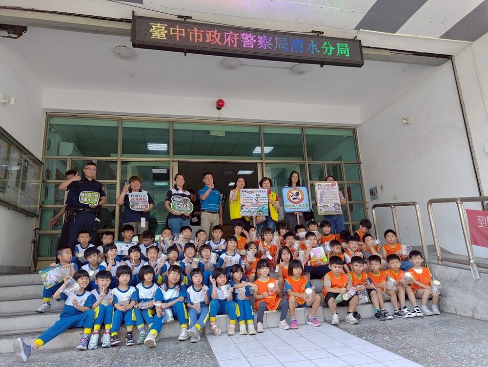 清水警分局清水派出所突然來了一群小小「實習生」,他們是來自幼兒園的小朋友們,來體驗警察的生活,讓原本較為嚴肅的派出所因可愛的問候及笑聲變得熱鬧許多,透過此活動讓小朋友體會交通指揮,得知安全過馬路、並認識道路號誌、標誌、標線,培養學童交通安全的重要性,活動中也藉由有獎問答、寓教於樂方式,進一步教導並落實小朋友建立「禮讓行人及安全過馬路」的正確交通安全觀念,其中在課程中最讓小朋友期待的環節,便是陳列在桌上的警察應勤裝備介紹,每位小朋友都感覺很新鮮及興奮,平常只能在馬路上看見警察辛苦的指揮交通,從沒近距離看過警察執勤的防彈衣、反光背心、警帽,及指揮棒,每位學童都超興奮能在此課程體驗當小小警察,為這次特別的校外教學旅程留下深刻的印象