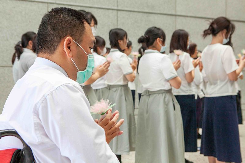 在靜思精舍德昕師父、德劭師父、德愔師父和德懿師父的帶領下,師生們沐浴在「靜寂清澄」浴佛聲中,雙手合十齊心祈福,用最虔誠恭敬心和步伐,洗滌內心的無明煩惱,化善念為力量,安定自心,守護世界。更以慈悲與祝禱,傳遞希望與溫暖。