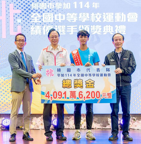張善政指出,桃園代表隊在本屆賽會表現亮眼,其中吳育廷同學110公尺跨欄U20組更打破亞洲紀錄,展現頂尖競技實力,感謝教練、校長及家長們的長期付出與支持。此次總獎金超過4,000萬元,為歷年罕見,期望選手持續努力,在賽場上都能充分發揮最佳實力,為桃園爭光。