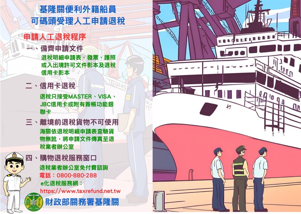 基隆關鼓勵船公司、港口船務代理公司向外籍船員宣導此服務。相關退稅疑問請洽中華電信退稅辦公室 ( e化退稅服務網:https://www.taxrefund.net.tw )。