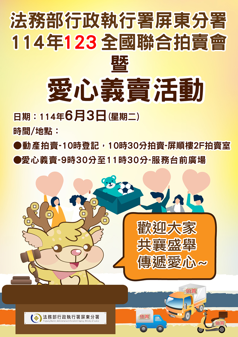 【記者范家豪屏東報導】法務部行政執行署屏東分署近幾年舉辦許多公益活動,此次為落實「執行有愛、公義無礙」之政策目標,特於114年6月3日(週二)上午9時30分至11時30分在屏東市建豐路180巷28號屏東分署拍賣室舉行愛心義賣活動,由屏東分署同仁捐贈愛心物資,義賣所得全數納入該分署愛心基金,專款優先用於屏東分署轄區之弱勢義務人。