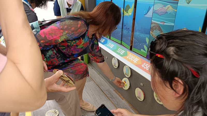 來到「現在的地球」這一站,志工提供紙箱、寶特瓶、紙尿褲、玻璃瓶……十二種物品,請長者依物品分解時間從一年內、五年……四百五十年、千年擺放,一直到燈全亮,才表示完全正確。