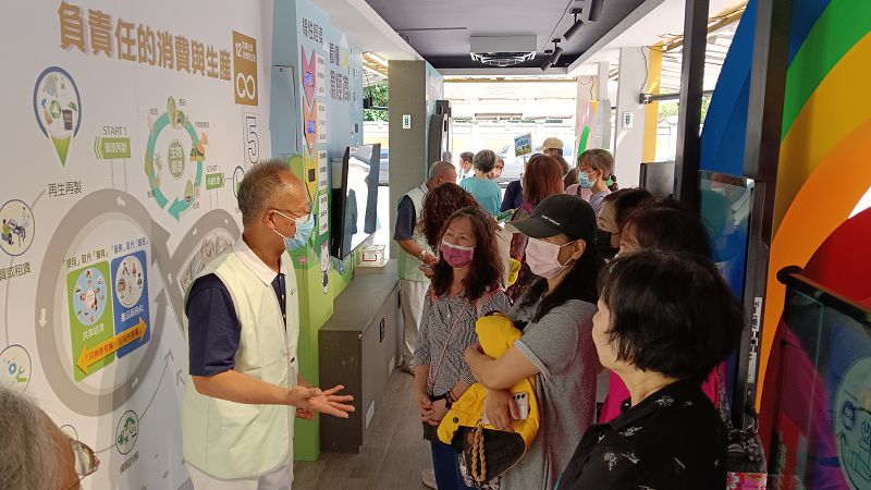 導覽志工朱美丹分享與小朋友和長者的解說互動不一樣,小朋友是給他一個知識,告訴他5R可以怎麼做,透過動作讓他記憶,一定要記住5R所以一定要再複習一遍,還可以考考他們。但是長者因為有些生活經驗,所以在互動上是很容易有共鳴。跟長者講希望可以把5R傳達出去,而長者會擔心記不住,就更用心聽。