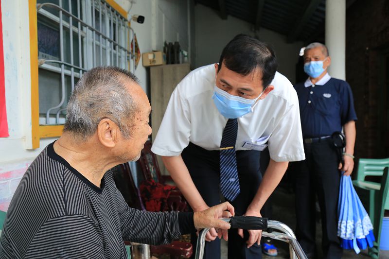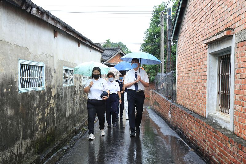 阿公在屋簷下以四腳助行器走了一小段路,走得算平順,黃淑秋護理師以台語慢慢的勸導阿公多站或行走,增加下肢的肌力,人醫會長期的關懷,阿公就如自己家人般,相約下個月再見。