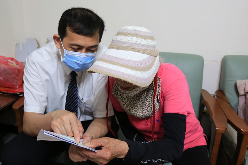 經護理人員量測,徐阿嬤血壓值偏高,她表示有頭暈的困擾,有時也不太敢參與太多活動,蔡主任請她要定時量血壓,並做記錄,回診時再給醫師看,阿嬤無奈的說:「我不認識字,也不知怎麼寫?」蔡主任耐心一步一步教導,耐心的聆聽阿嬤日常生活煩惱,給予安慰鼓勵,離去前,志工並祝福阿嬤母親節快樂。