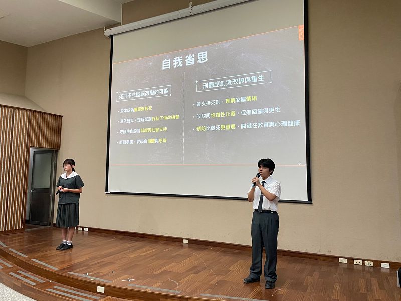 高一林名紵和陳予晞從資料查找中進行理性思辯,兩位從原本贊成死刑的立場試圖理解支持與反對雙方的立論基礎,從人權觀點出發思考:什麼才是公平正義的底線?深入探討法治與人權,結合案例分析,培養學生公民素養與同理思辨。