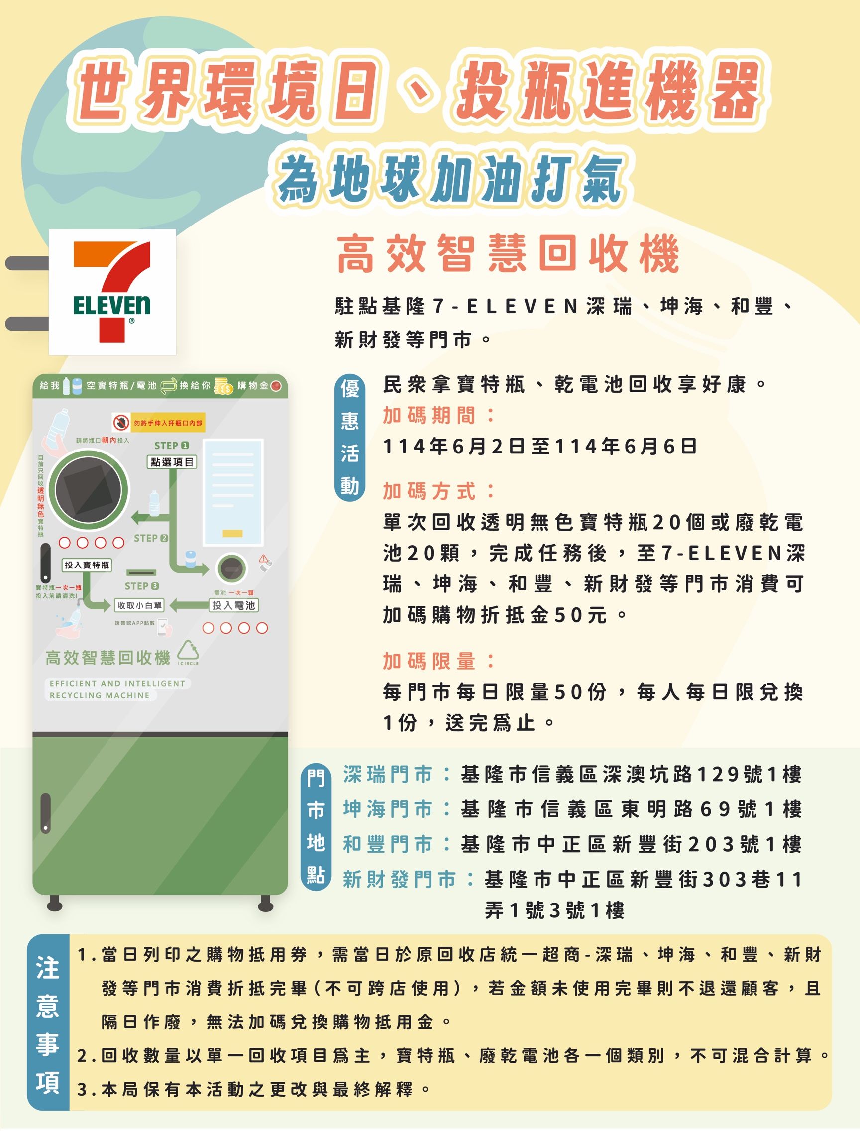 今年為響應世界環境日,環保局將於今年6月2日到6月6日,辦理為期5天的快閃回收加碼活動,民眾收集5顆電池(1號、2號、3號、4號及9V型)或5支寶特瓶(PET材質、去除包裝之透明無色寶特瓶),到7-ELEVEN四間門市所設置高效能智慧回收機完成回收,除可兌換基本的OPEN POINT點數或是購物抵用金外,單次回收投入寶特瓶20支或廢乾電池20顆,即可憑加碼列印的50元購物抵用券,至7-ELEVEN 4間門市消費折抵,抵用條件為限門市且限單次消費折抵完畢,單次消費限用1張,恕不找零,快閃活動期間每台智慧回收機,每日提供50份購物抵用券,每人每日限兌換1份,以增加智慧回收機曝光度,讓市民能多加利用。