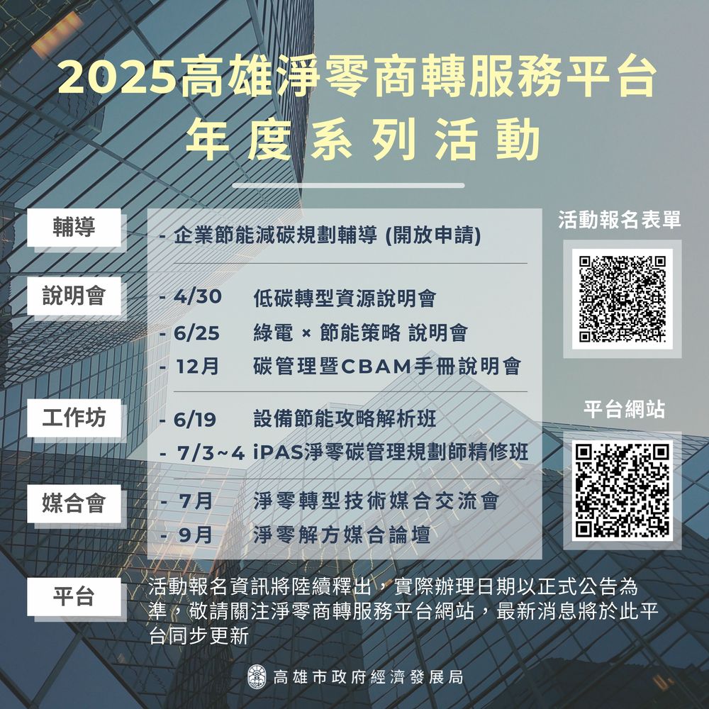 為協助高雄在地企業迎接淨零排放新時代,高雄市經發局6月起全面啟動「淨零商轉服務平台」年度系列活動,以輔導、媒合、資源連結三大作業面向,攜手產業邁向低碳轉型,打造城市永續競爭力;在輔導方面,6月率先登場「設備節能策略解析班」與「綠電×節能策略說明會」,7月辦理經濟部iPAS淨零碳管理規劃師考前衝刺班;媒合方面則透過論壇與說明會促進技術與需求對接,搭建產業間技術與資源對接平台;資源連結是從化身企業低碳轉型的寶百袋,讓企業不再為尋找資源而苦惱。經發局表示,活動資訊陸續於「高雄淨零商轉服務平台」釋出,相關輔導需求或活動問題,可洽本局專責窗口(07)3313152向李小姐、焦小姐詢問。(圖文:記者于欽智)