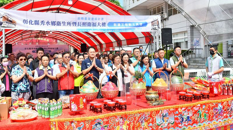 【記者鄭惠珠秀水報導】前瞻基礎建設計畫「公共服務據點整備之整建長照衛福據點計畫-秀水鄉衛生所暨長照衛福大樓新建工程動土典禮記者會」11日由彰化縣長王惠美、衛福部長照司副司長吳希文與各級民代等人共同執鏟動土。