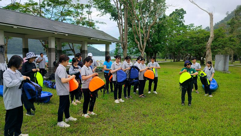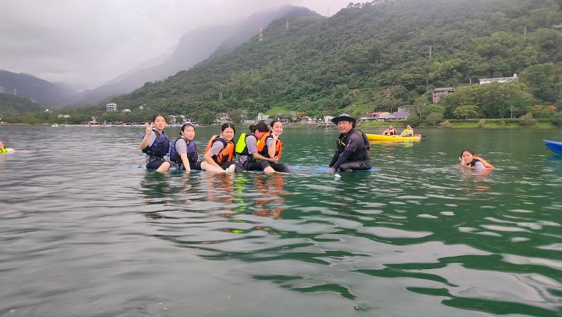 除了划行練習,教練更設計了船隊集結與橫越湖面的任務,考驗同學間的默契與應變能力。當隊伍抵達潭中央深達15公尺處時,進行了模擬翻船體驗。即便是不諳水性的學生,也能在救生衣的保護下享受漂浮與踩水的感覺,也成功克服了對深水的恐懼。