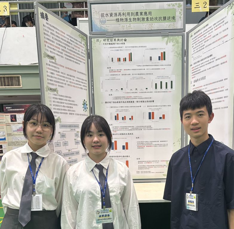 本次得獎作品的研究主題,聚焦於以中藥成分作為植物源生物刺激素,提升小球藻在高鹽環境下的耐受性與淨水效果,並創新地將培養小球藻後的廢水再利用於作物灌溉,達到水資源再利用與農業增產的雙重目標。此一研究兼顧環境永續與農業應用,充分展現高中生關懷社會議題與解決實務問題的能力。