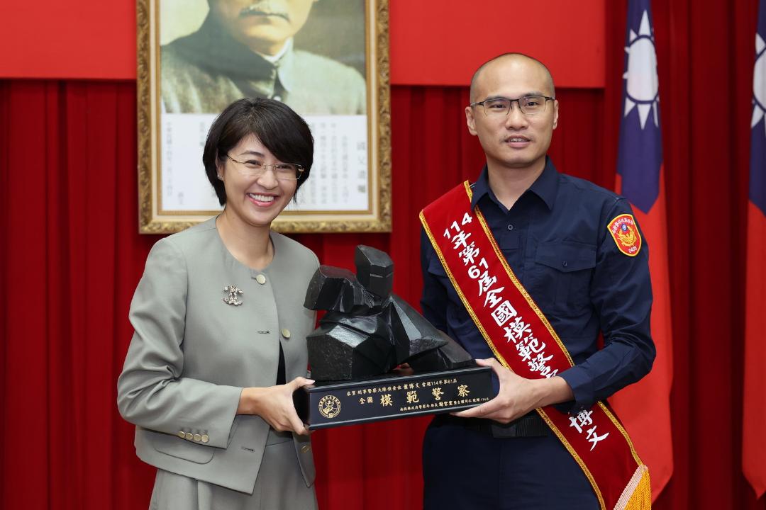 許縣長指出,宜居繁榮的城市需要有良好的治安及交通做後盾,南投縣幅員遼闊,警方在緝毒、打詐、掃黑、婦幼、治安等方面都克盡職守,努力推動各項業務,對局長謝宗宏及其所率領的警察團隊付出表示感謝及肯定。6月15日是警察節,縣府特地在警察節前夕頒獎表揚優秀警察,此次共有19位同仁受獎,其中2位是模範警察、17位是績優同仁,得獎同仁可說是實至名歸。另外也感謝縣議會對在經費上的支持,讓警方同仁有更穩定安全的設備及裝備工作,南投茶博會及國慶焰火將於10月份登場,屆時勢必湧入更多人潮,工作更加繁重,她代表縣民感謝警察同仁的付出,祝福大家警察節快樂。