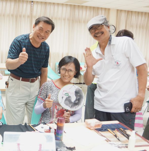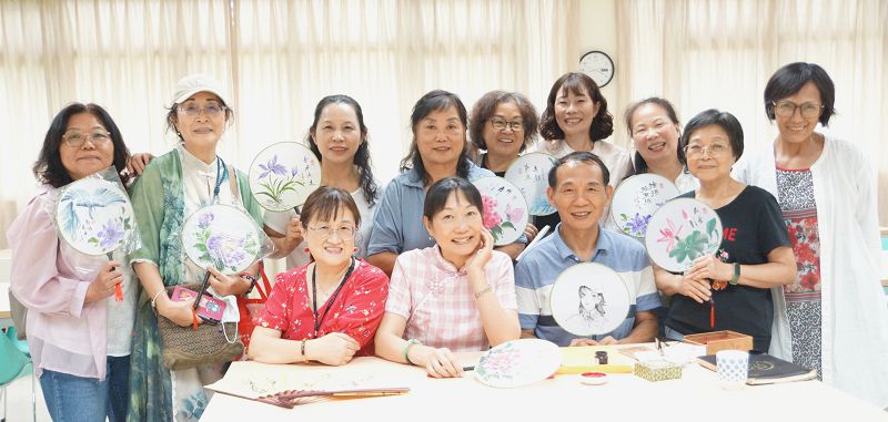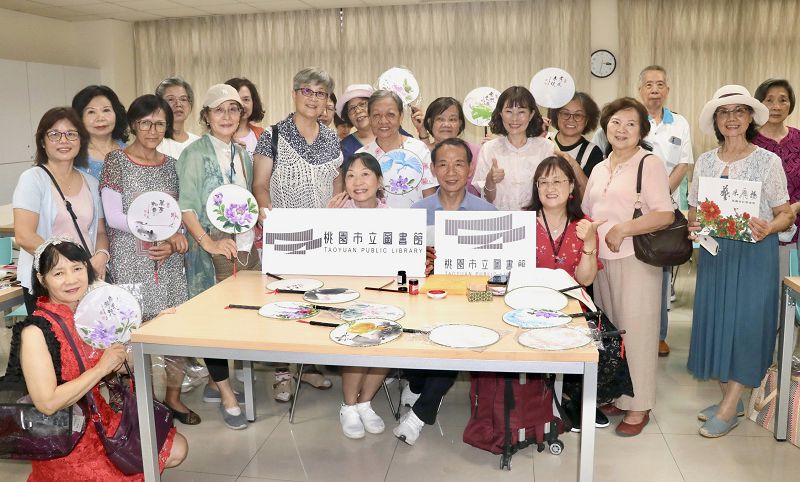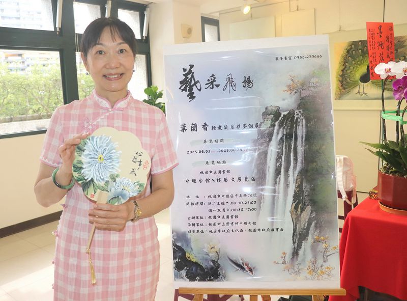 【記者吳惠民、鍾陽正桃園報導】桃園市台藝書畫學會理事長葉蘭香於即日起至6月29日在桃園市圖書館中壢分館3樓舉辦「藝采飛揚葉蘭香彩墨個展」,並於日前舉行藝術分享會,邀請各界愛好藝術者前來分享葉蘭香老師藉由藝術展現其生命內觀之情之精妙創作,此外,還特別邀請原住民族名書畫家高春英、名書法家鄭添煌及國畫班高手陳梅華、邱梅珍、尹靜蘭、黃秀霞等人現場揮毫手繪宮扇,除讓大家能有觀摩學習書和畫的機會,更為前來的貴賓免費製作屬於自己獨一無二的手繪涼扇,吸引超過百位民眾熱烈參與,場面溫馨熱鬧!中壢圖書館主任劉銀丹、台灣導報副社長吳惠民等人亦前往共襄盛舉。