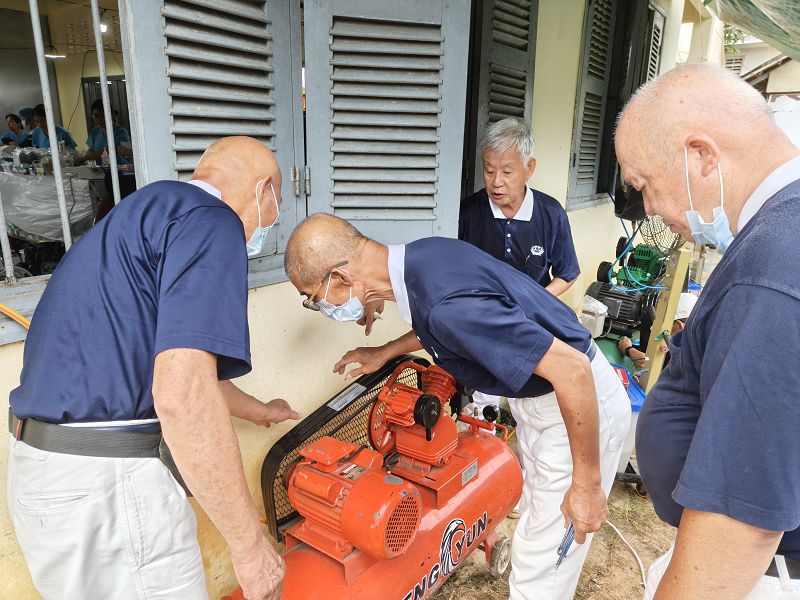 張讚生與吳啟明已有多年默契,義診現場更是駕輕就熟。他們明白,醫療現場的電不能斷,任何設備故障都需即時排除。消毒鍋、洗牙機、牙科空壓機,甚至其他科別的發電機,皆需隨時待命,確保設備維持最佳狀態。