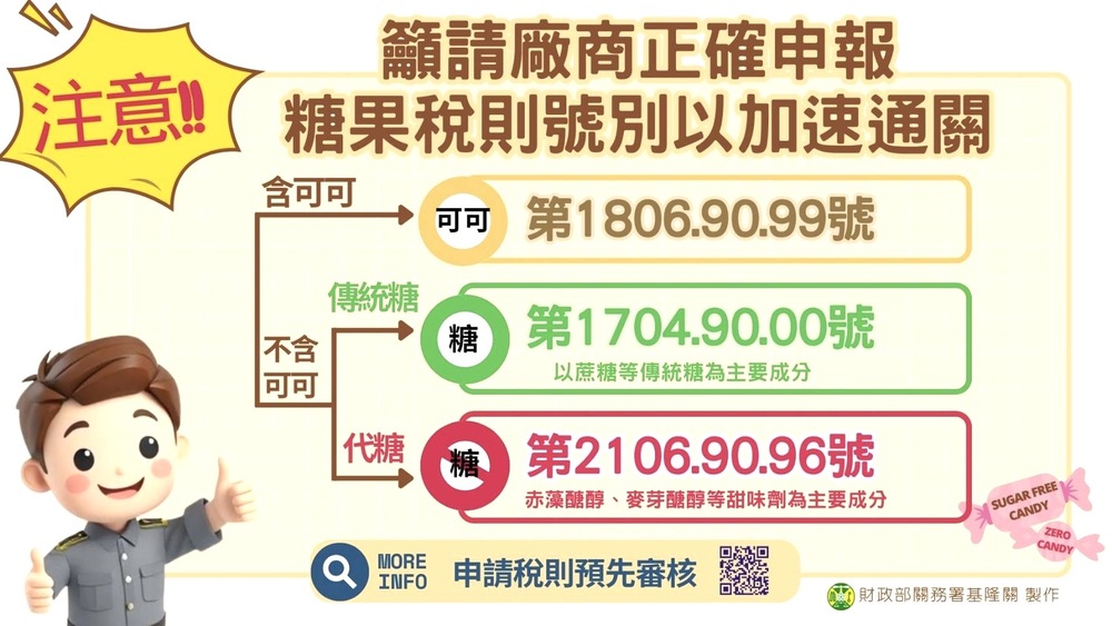 基隆關副關務長吳慧燕提醒,貨物千百種都與商民生活相關,稅則制定有其基本意義,如對國內產業發展及國民健康影響;因此海關需要宣導釐清,雖然代糖稅率稍微高一點,但仍應正確分類有利加速通關。再次提醒:如係以代糖(如赤藻醣醇、麥芽醣醇、山梨醇等)製成,應歸列2106.90.96(稅率30%)「以合成甜味劑替代糖之糖食、口香糖及類似品」。HS制度依據明確依「國際商品統一分類制度(HS)」註解:第1704節屬「以蔗糖、葡萄糖等傳統糖為主」製成品。使用代糖製成則應歸於第2106節「未列名食物調製品」(包括白色巧克力)。含可可糖果(無論用傳統糖或代糖)應歸1806.90.99號「其他弟1806節所之貨品」。