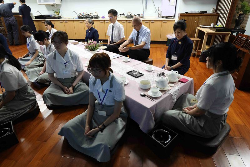 踏入慈濟大學介仁校區的茶道教室,生活美學氛圍感十足,從桌上的茶花擺設、中式的蓋碗杯到英式的下午茶,搭配的茶葉,都有對應的主題。從門口接待到淨手儀式,每一環節皆由梳整得體、服儀端正的大學生細心呈現。這般講究與慎重,正是慈濟大學通識教育中心「茶道藝術鑑賞」選修課的期末考。