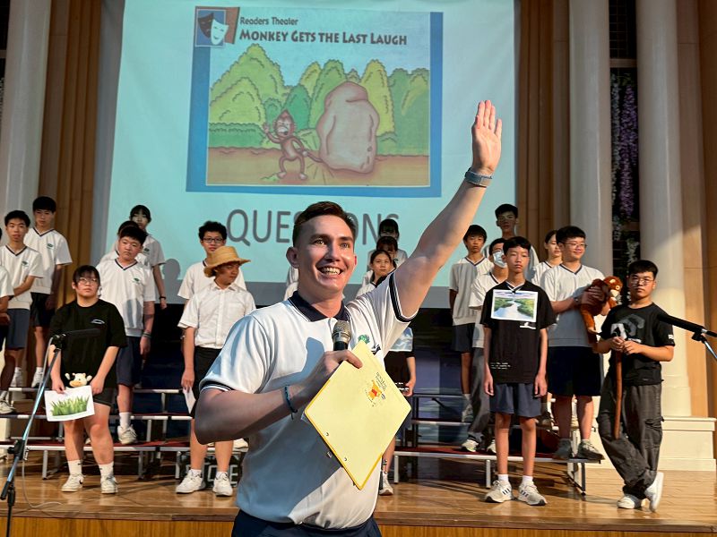 今年的讀劇比賽依舊由外籍老師Chris老師和Aydar老師擔任主持人,Chris老師為大家介紹出場班級及各班表演的故事大綱;Aydar老師則於各班表演結束後,進行有趣刺激的有獎徵答。兩位老師的活力與熱情,讓臺上臺下毫無冷場。