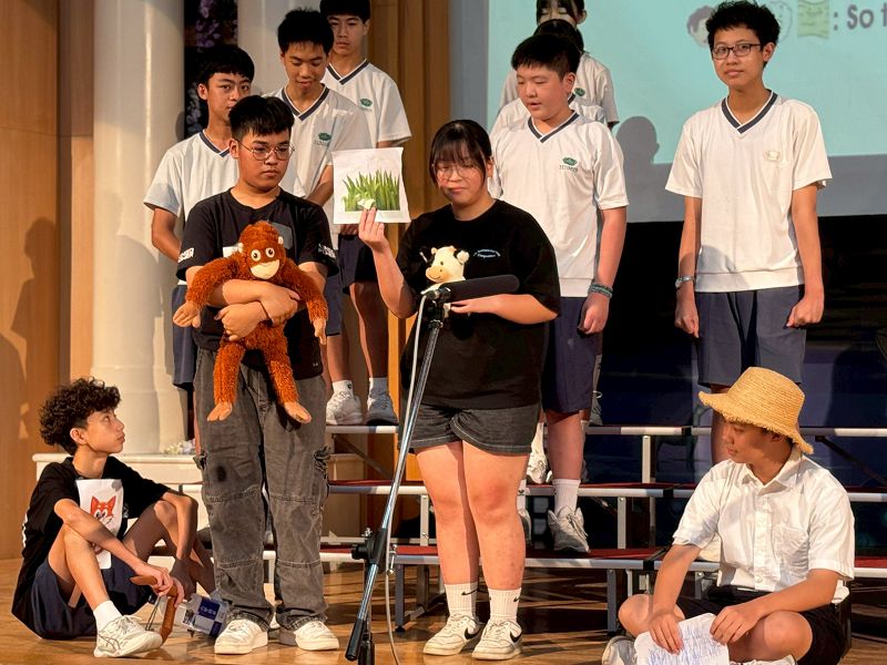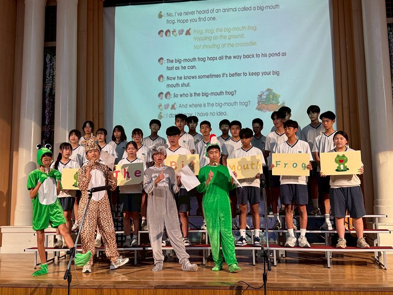 國二善解班演出的則是Monkey Gets the Last Laugh,學生帶著玩偶扮演故事主角小猴子,加上可愛逗趣的聲音表情,相當逼真,令人印象深刻。國二感恩班詮釋的是The Big-Mouth Frog,學生穿上絨毛的動物戲服扮演動物,手腳並用地做出動作並唸出台詞,相當活靈活現。