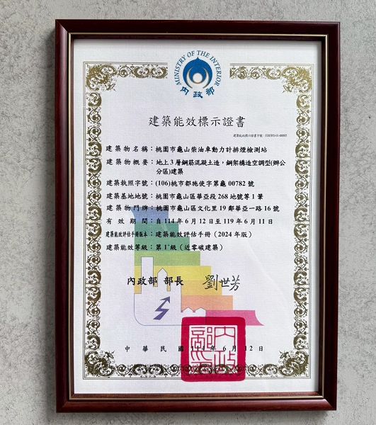【記者徐玉英桃園報導】桃園市環保局為實現2050淨零碳排的城市願景,在推動綠色建築與低碳治理再創新亮點。位於龜山的柴油車排煙檢測站,18日正式榮獲國內建築能效最高等級──「第1+級近零碳建築」認證,成為全國首座通過此認證的環保設施,展現桃園引領全台邁向永續建築的實力與決心。該檢測站在綠建築九大指標(EEWH系統)中全面表現優異,涵蓋綠化量、節能減碳、水資源管理、廢棄物減量、室內環境改善等面向,充分體現低碳營運、永續發展的理念,也象徵桃園在建築轉型上已與國際綠建築標準接軌。