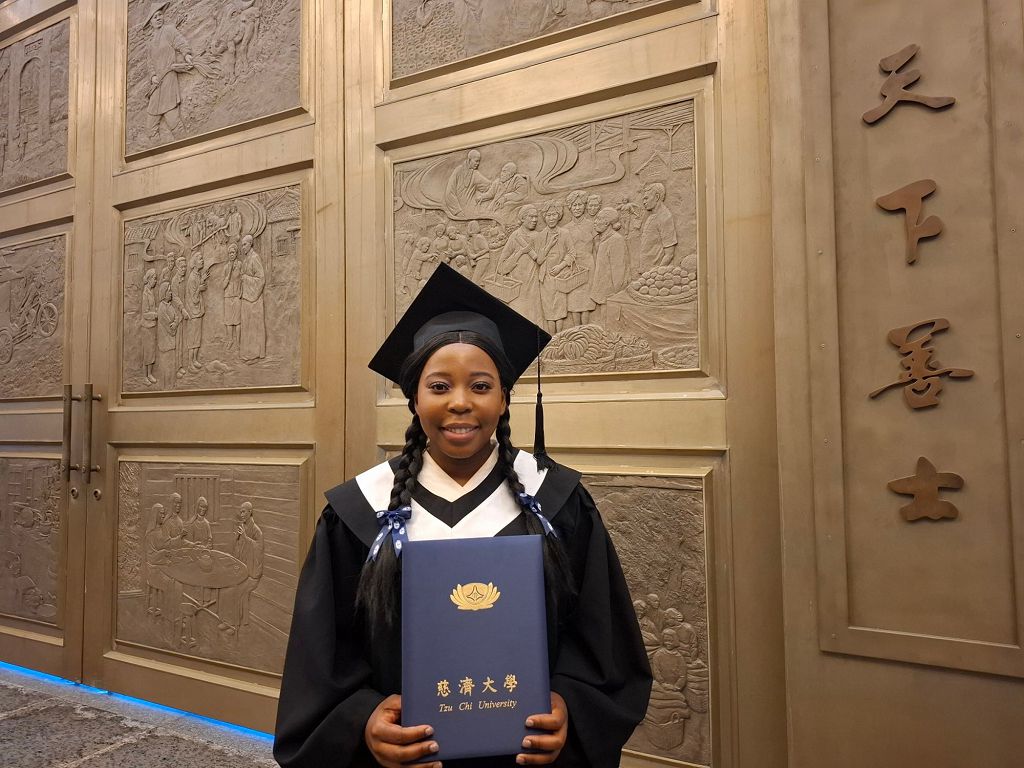 慈濟大學致力於培育國際人才,今年畢業生中有來自美國,烏克蘭,吉爾吉斯,莫三比克,馬拉威,韓國,馬來西亞,印尼,印度,越南,巴基斯坦,孟加拉,新加坡,泰國,香港、菲律賓等地的學生。來自莫三比克的柯欣甜(Cristina Narcisia Muchanga),在台灣學習近六年,柯欣甜積極參與校內外活動,從學校活動轉播、慈濟營隊翻譯,到國際文化活動總是熱情投入。她說:「我要把握在台灣學習的時間,想要將在台灣學會的帶回去幫助更多人。」