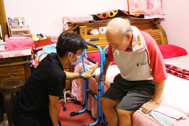 面對這典型的「老老照顧」困境,鄭醫師不僅細心地診察病情,更與照顧者充分溝通、衛教,提醒應定時翻身,避免久臥不動,以延緩病情惡化。在得知詹阿伯起床困難,鄭主任到「慈濟環保輔具平台」申請輔具,並親自到慈濟嘉義園區載回一個「床邊扶手」,親送至詹家,現場教導詹阿伯如何施力及正確使用,預防跌倒風險。