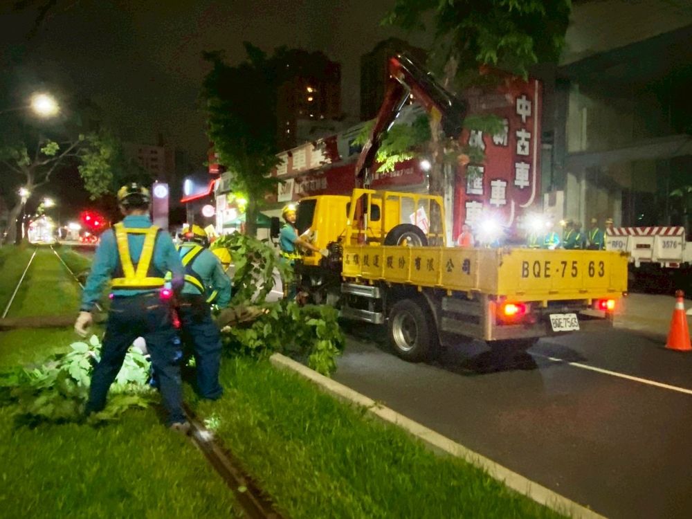 【記者陳志昌高雄報導】因應颱風雨汛將至,高市府捷運工程局、警察局(含捷警隊)及高捷公司,24日深夜11時於大順路及聯興路口旁舉辦輕軌防災聯合演練,狀況係模擬汛期樹木傾倒造成輕軌列車無法通行的緊急應變處理,以確保輕軌安全行駛,捷運局局長吳嘉昌親臨視導。