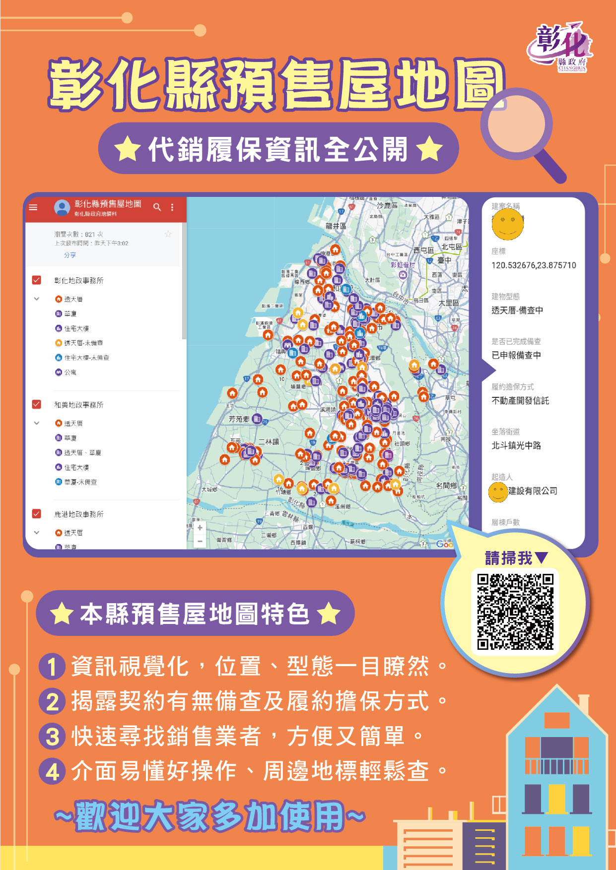 【記者鄭惠珠彰化報導】為了讓民眾在選購預售屋前能獲得充分的銷售資訊以作為建案選擇和比較的參考,彰化縣政府與所轄8個地政事務所合作,利用免費的Google Maps加值功能研究開發「彰化縣預售屋地圖」(網址:https://reurl.cc/nqeG21),該服務已正式上線,開放民眾查詢使用,歡迎多加利用。