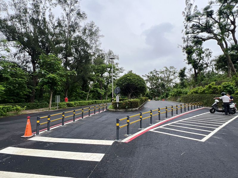 工務局長楊欽富表示,澄清湖大門至後門主要通道西岸道路,既有路面老舊且未將人車分流,沿線原設置減速墊,車速快有影響人車安全之虞。為此,該局道工處除針對瀝青路面改善,並將減速墊改為9處「減速平台」,透過鮮明的黃色塗層搭配箭頭指向,強化視覺警示效果加上行車路感,可提醒用路人注意平台,達到減速效果,並配合市府交通局動線規劃新增人行通道,且規定全區車速速限為時速20公里,提升行人安全。