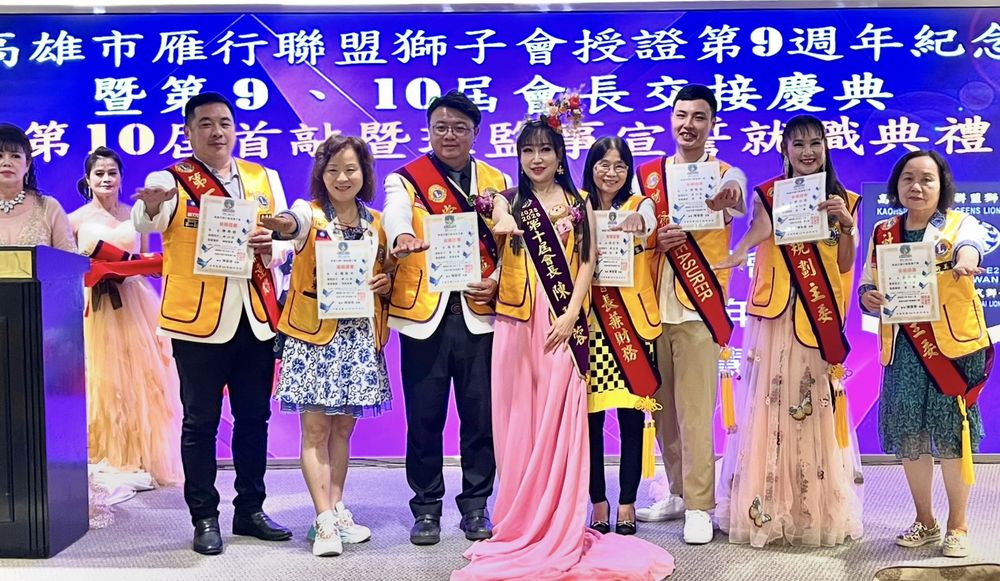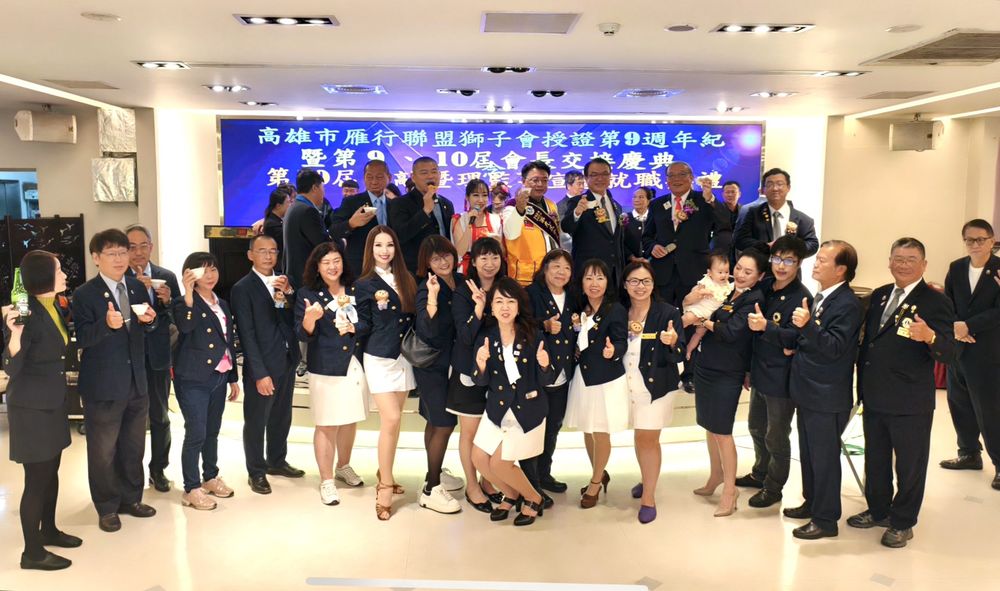 【記者于欽智高雄報導】國際獅子會300E5區高雄市雁行聯盟獅子會授證九週年,日前在高雄寒軒大飯店和平店舉行,第9、10屆授證交接暨第10屆第1次例會暨理監事及幹部就職交接典禮,由第9屆前會長吳俊緯交棒給第10屆新會長陳慧蓉,在現任區總監陳明賢監交見證下、由候任總監李慶春、第一副議長王坤義、第一副總監楊婉琪、第二副總監邱朝雄與300E1區前總監楊政城及區行政團隊、會長聯誼會等理事及幹部與顧問均到場觀禮祝福。