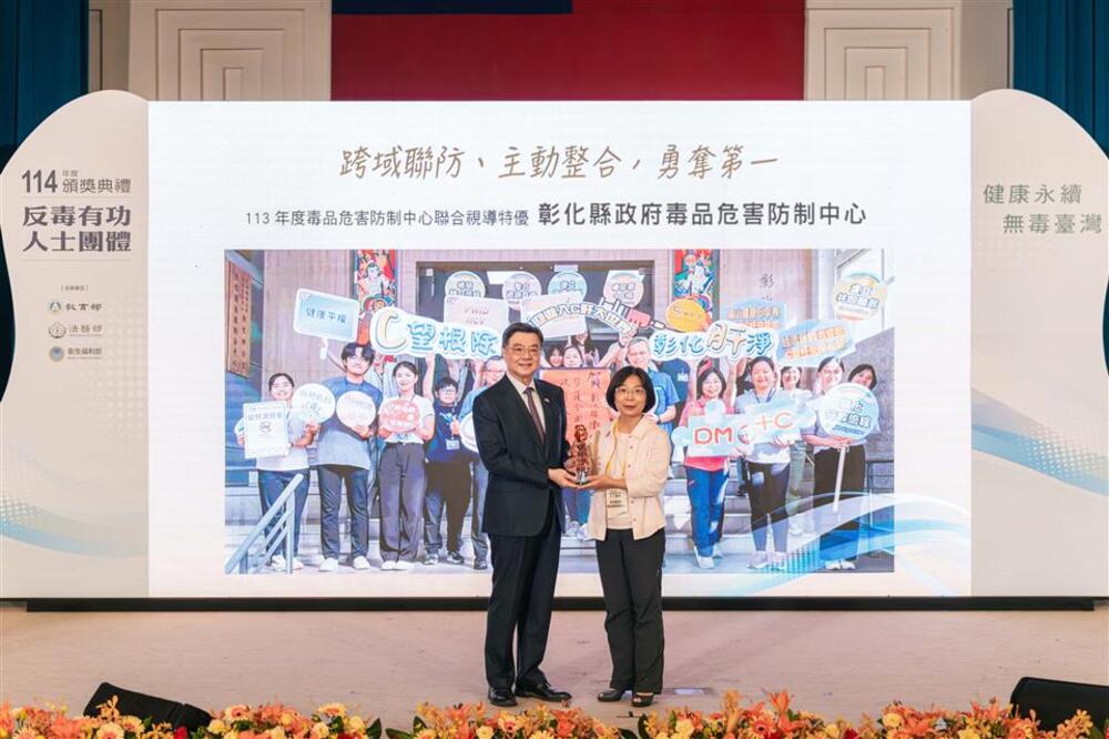 【記者鄭惠珠彰化報導】衛生福利部於6月24日在國家圖書館舉行「114年反毒有功人士團體頒獎典禮」,彰化縣毒防中心榮獲113年度毒品危害防制中心跨部會聯合視導第二類組「特優」獎項,總統賴清德親自主持頒獎典禮,彰化縣衛生局蕭惠玲副局長出席代表領獎,榮獲卓榮泰行政院長公開頒獎表揚,展現彰化縣推動毒品防制工作上的成效與創新。
