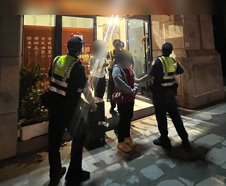 中市警三分局在五月廿九晚間前往東區精武東路一家泰式養生館執行臨檢勤務,發現正在從事按摩工作的兩名女子不諳中文,經盤查得知二女皆來自泰國,對警方詢問一臉茫然且頻頻搖頭,店家負責人向警方表示,兩名員工不會說中文,平時都透過翻譯軟體溝通,然二女受僱從事按摩工作事證明確,員警要求她們收拾隨身物品,帶返賡續調查;警方查出,二人在今年二月即持觀光簽證來臺,已逾停留期限且無合法工作資格,警訊後將二女送往移民署臺中專勤隊擇期遣返回國,另店家部分則依就業服務法函請相關單位裁罰。(記者許順德翻攝)