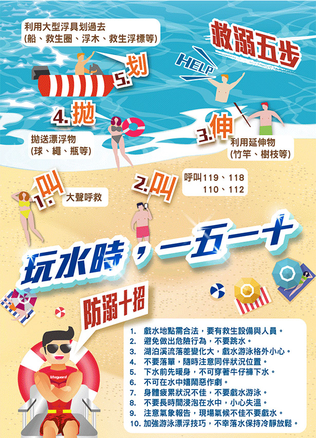 除了選對地點,事前的防溺觀念與急難處置知識更是關鍵,彰化縣消防局提醒民眾牢記「防溺十招」與「救溺五步」: