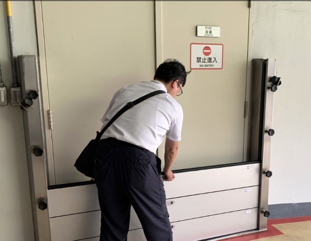 圖:台中捷運人員在測試安裝防洪檔是否板牢固。(記者彭勝郎攝)
