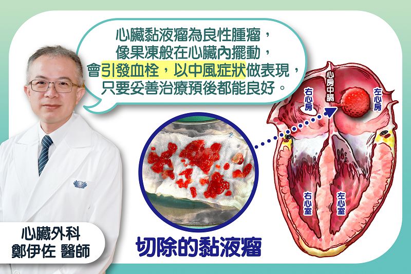 鄭伊佐醫師解釋,心臟黏液瘤是心臟內最常見的原發性良性腫瘤,約八成生長於左心房,黏液瘤質地柔軟、形狀像果凍,會隨心跳在心房與心室間擺動。一旦腫瘤阻塞瓣膜出口,就會干擾血液流向全身,形成血栓,血栓流出阻塞血管導致腦部缺血,進而出現中風症狀。